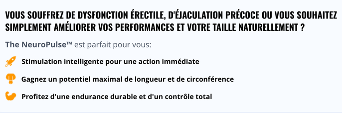 NeuroPulse PRO utilise une thérapie par ondes cliniquement testée pour stimuler les tissus, améliorer la circulation sanguine et déclencher la régénération naturelle. C'est une solution non invasive et sans médicament conçue pour soutenir les performances masculines, la qualité de l'érection et l'endurance.