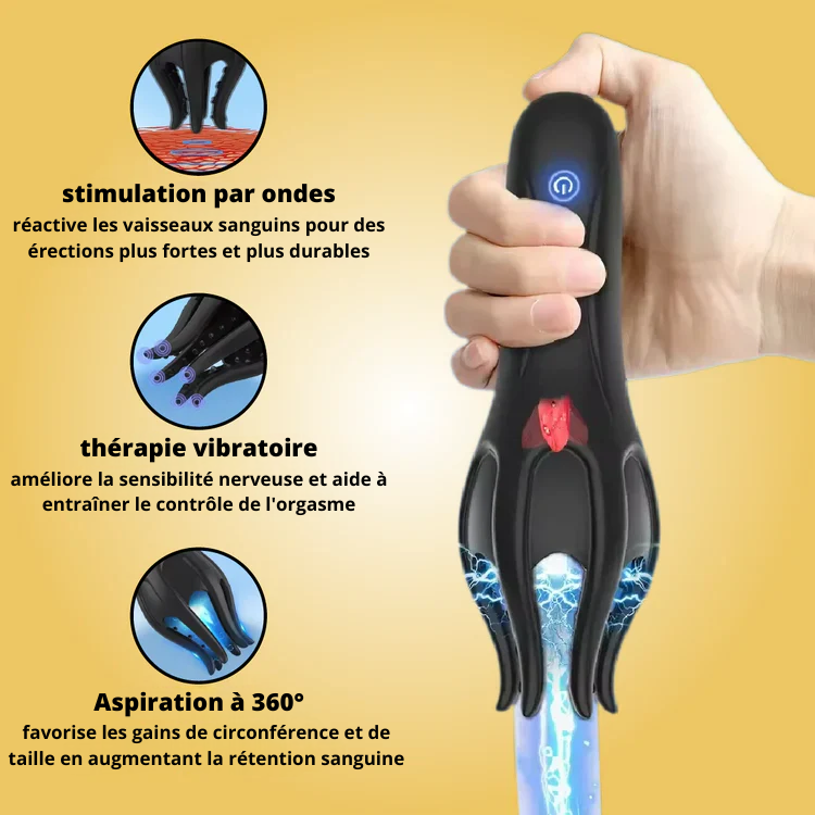 Le système d'aspiration NeuroPulse PRO™ 360° exerce une pression douce et progressive sur la verge, favorisant une expansion saine et une croissance vasculaire progressive. Ce mouvement imite l'engorgement naturel, mais avec une intensité structurée.
